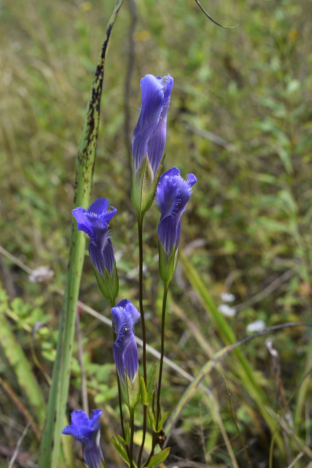 Large Fringed Gentian (Gentianopsis crinita) and Stiff Gentian/Ague Weed (Gentianella quinquefolia) grow together along this bank.